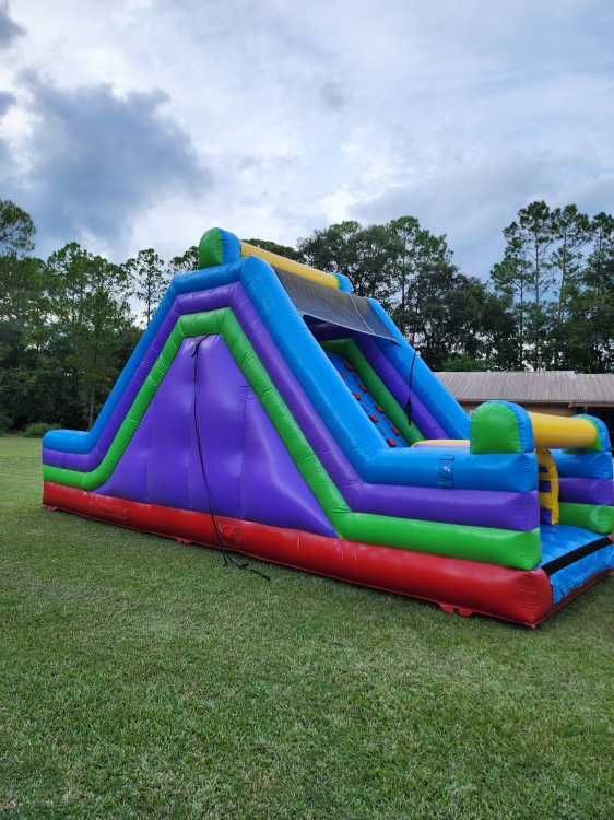 Part climbing challenge, part thrill ride: scramble up the rock-style handholds, tag the top, and rocket down a smooth slide. A high-energy centerpiece for birthdays, school events, and field days, perfect for friendly races and nonstop photo-worthy moments. Secure grips and a padded landing keep it fun with quick turnarounds. 30 Feet Long, 10 Feet Wide and 14 Feet Tall